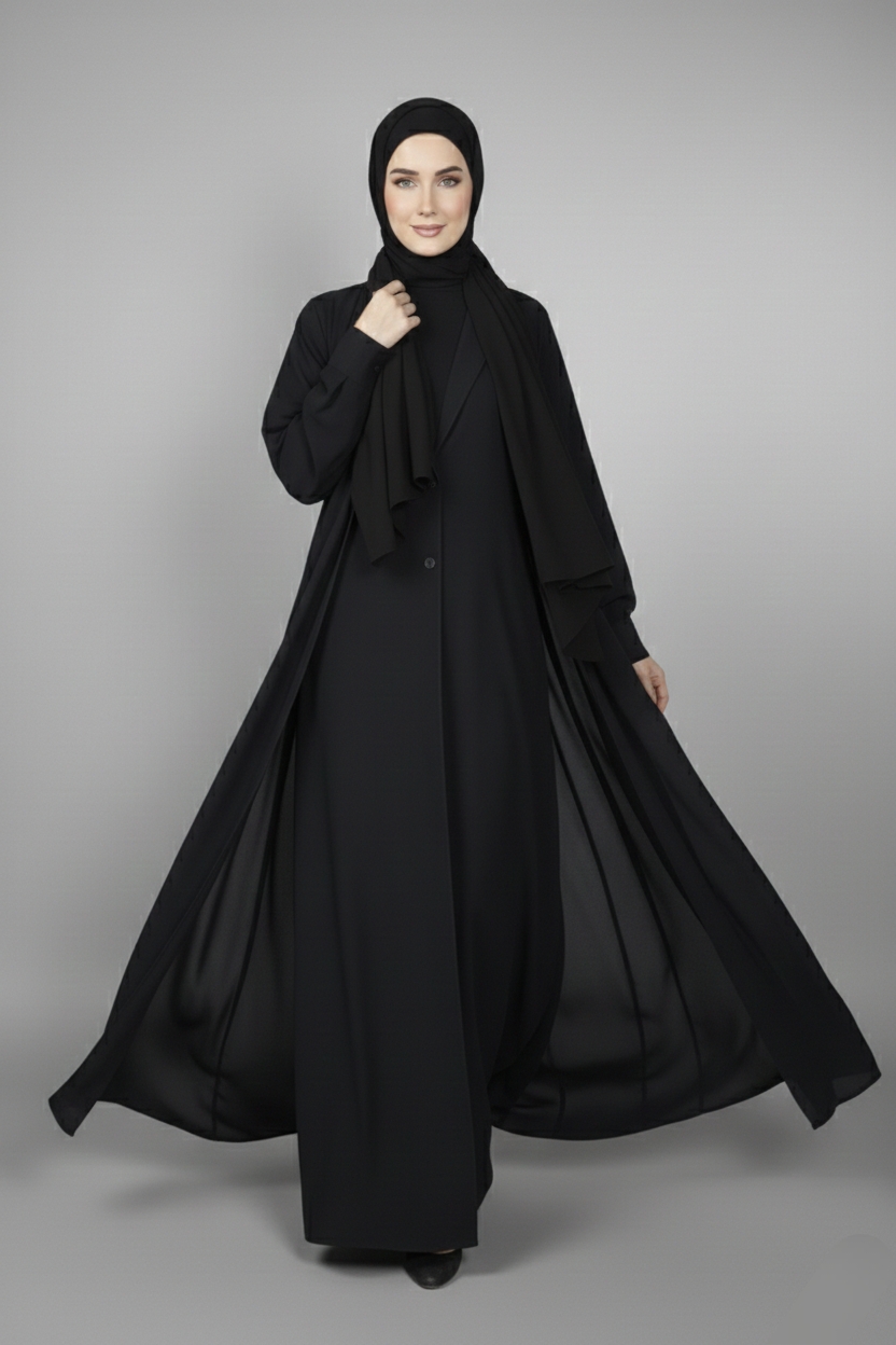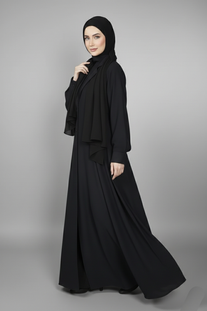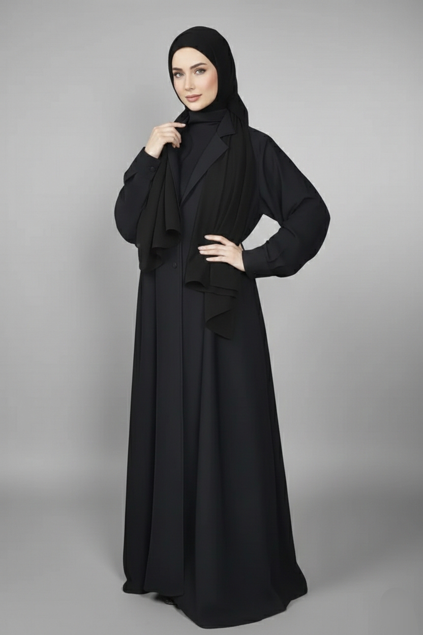 Sleek and modern, this black coat-style abaya combines structured elegance with timeless sophistication. The tailored silhouette gives a polished look, perfect for women who love a refined, fashion-forward style.