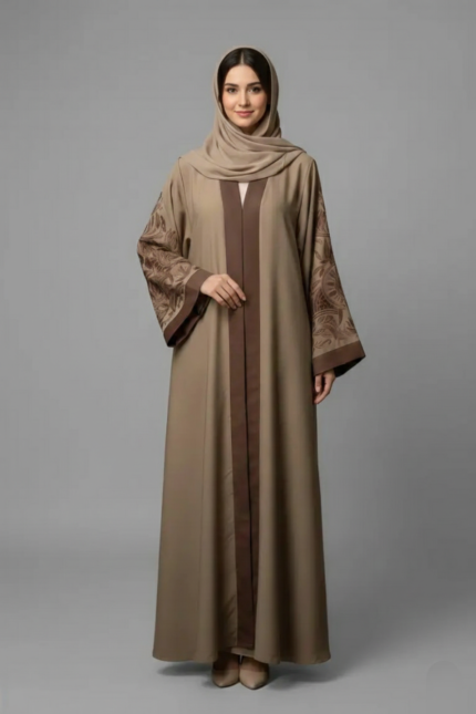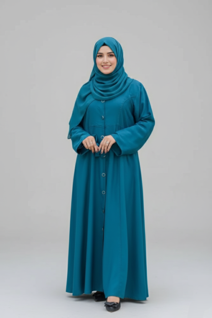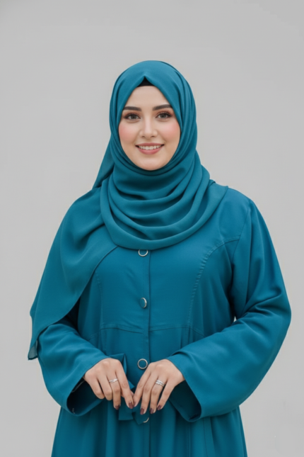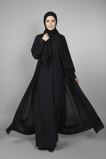 Sleek and modern, this coat-style abaya is crafted from soft, flowing fabric that drapes beautifully for a polished and flattering silhouette. Its structured design gives a contemporary, tailored look, perfect for stylish layering.