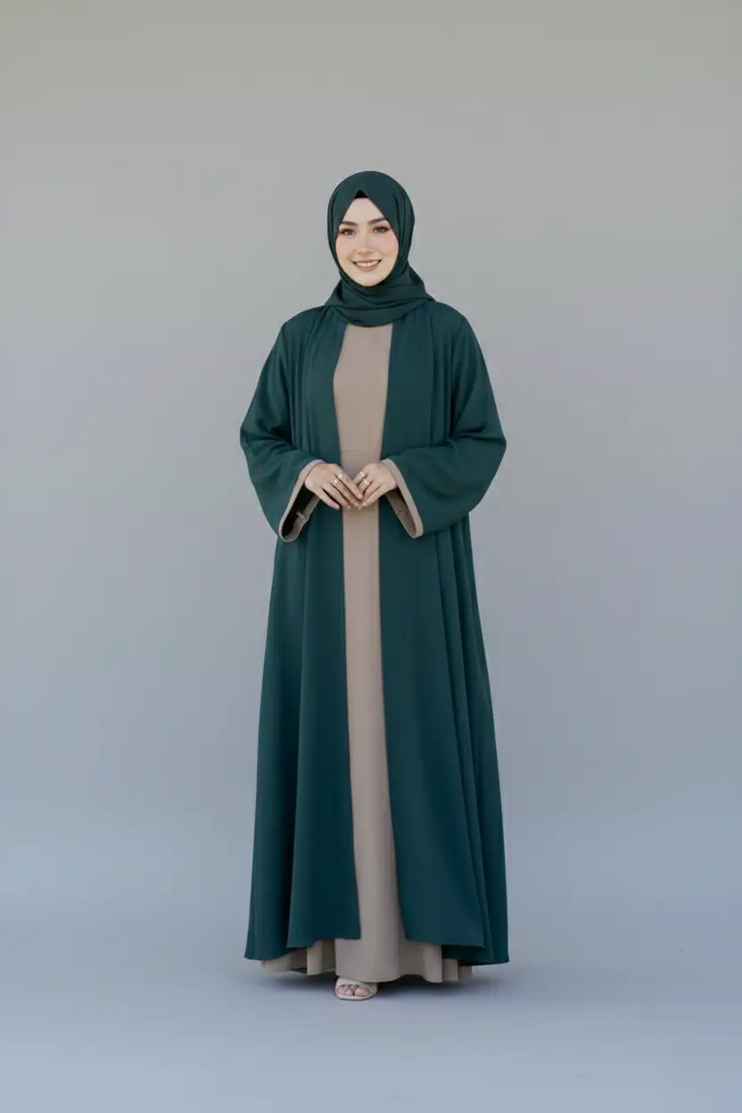 Elegant and versatile, this front-open gown abaya is crafted from soft, flowing fabric that drapes beautifully for a flattering silhouette. The front-open design allows easy layering, while the inner maxi provides a complete, polished look.