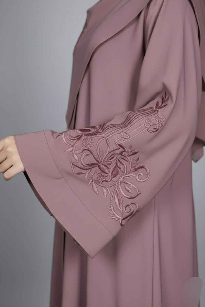 Intricate embroidery on the sleeves adds a touch of elegance and refinement, enhancing the overall look with subtle charm. Ideal for festive gatherings, evening events, or polished everyday wear, this abaya blends modern style with timeless sophistication.