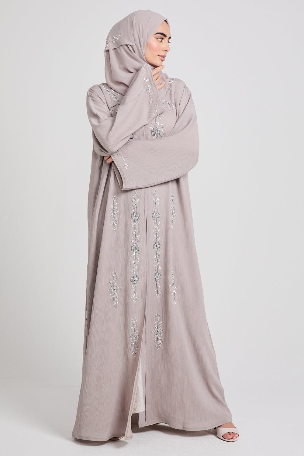 The Premium Textured Embellished Open Abaya in French Oak is a true expression of romantic sophistication and timeless charm. Crafted from soft, textured fabric, it offers a graceful drape that feels as luxurious as it looks, keeping you comfortable while maintaining a polished silhouette.